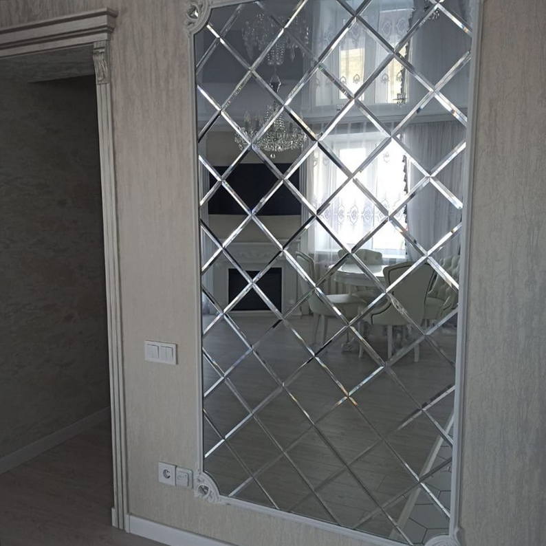 Использована квадратная серебристая зеркальная плитка размером 18х18.