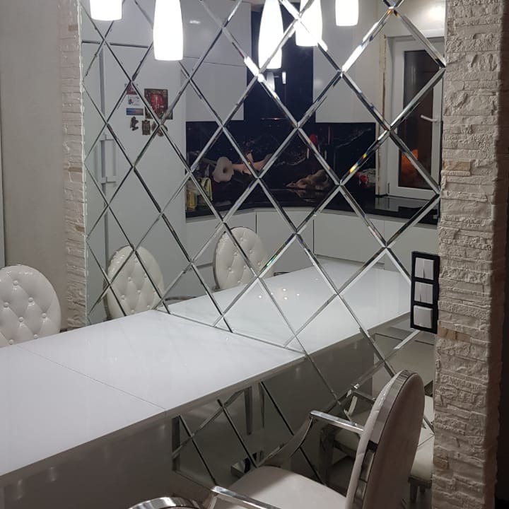 Использована зеркальная плитка вытянутый ромб размерами 20х34.